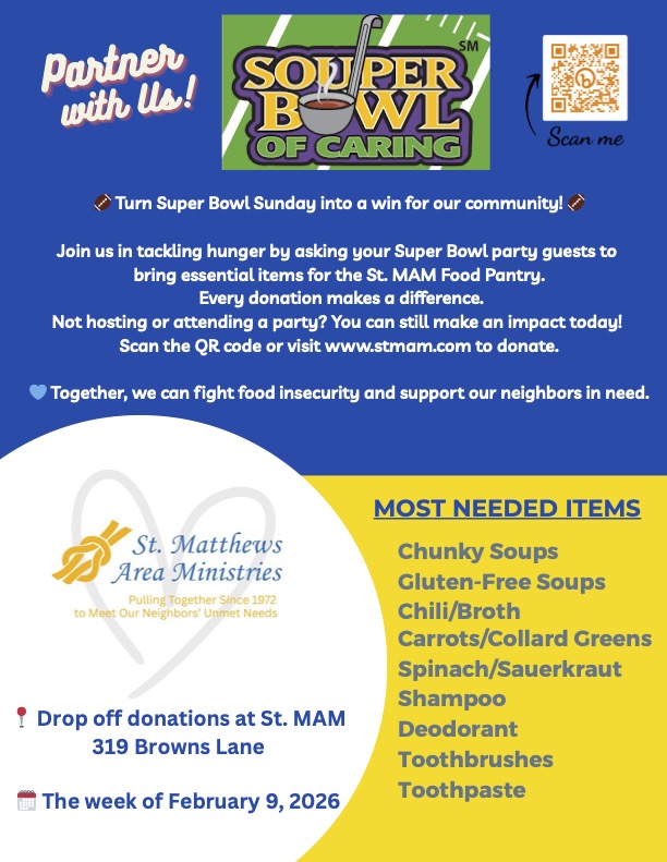 Hosting or attending a Super Bowl party? While you shop, consider adding a few extra items to your grocery cart for your neighbors in need. See the flyer for current needs and donation details. As always, thank you for supporting the fight to end food insecurity.